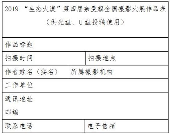 投稿作品以光盘(CD-R或DVD-R)、U盘存储形式邮寄至:北京市东城区东四十二条48号中国摄影报社 2019 “生态大漠”第四届奈曼旗全国摄影大展办公室收(100007)
