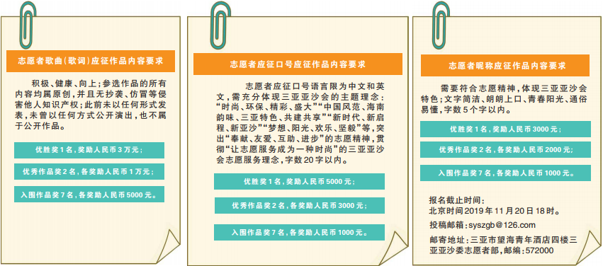 志愿者昵称需要符合志愿精神,体现三亚亚沙会特色;文字简洁、朗朗上口、青春阳光、通俗易懂,字数5个字以内。将评选出优胜奖1名,奖励人民币3000元;优秀作品奖2名,各奖励人民币2000元;入围作品奖7名,各奖励人民币1000元。报名截止时间:北京时间2019年11月20日18时。