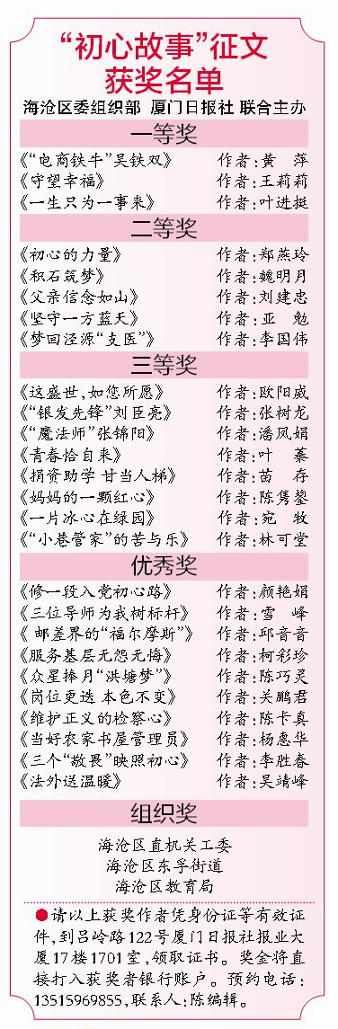 初心贵在恒守,使命重在担当。由中共海沧区委组织部、厦门日报社联合主办的“初心故事”征文活动圆满结束,昨日正式评出26篇获奖作品。其中,《“电商铁牛”吴铁双》《守望幸福》《一生只为一事来》等3篇作品获得一等奖,3家单位获组织奖。