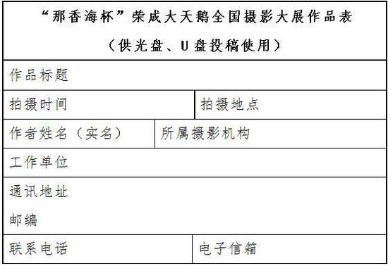 光盘、U盘包装盒上注明该展名称,每幅作品文件名处注明作品标题,同时提供作者资料及作品信息(word文档)。投稿作品为JPG格式,图片统一处理为长边600-1000像素,文件大小控制在500KB以内。无相关资料的投稿作品,主办单位有权取消其参评资格。投稿作品以光盘(CD-R或DVD-R)、U盘存储形式邮寄至:北京市东城区东四十二条48号 中国摄影报社活动部“那香海杯”荣成大天鹅全国摄影大展办公室收(100007)