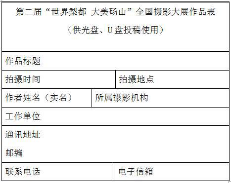 光盘、U盘包装盒上注明该展名称,每幅作品文件名处注明作品标题,同时提供作者资料及作品信息(word文档)。投稿作品为JPG格式,图片统一处理为长边600-1000像素,文件大小控制在500KB以内。无相关资料的投稿作品,主办单位有权取消其参评资格。投稿作品以光盘(CD-R或DVD-R)、U盘存储形式邮寄至:北京市东城区东四十二条48号中国摄影报社第二届“世界梨都 大美砀山”全国摄影大展办公室收(100007)