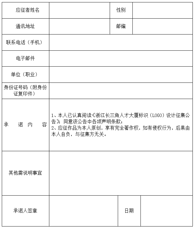 浙江长三角人才大厦标识(LOGO)应征承诺书