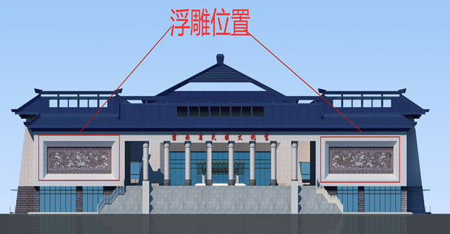 1.云南省民族文化宫建筑正门两侧墙面浮雕(两幅)设计,尺寸分别为(宽)17.2米×(高)4.8米,具体位置见建筑设计效果图。
