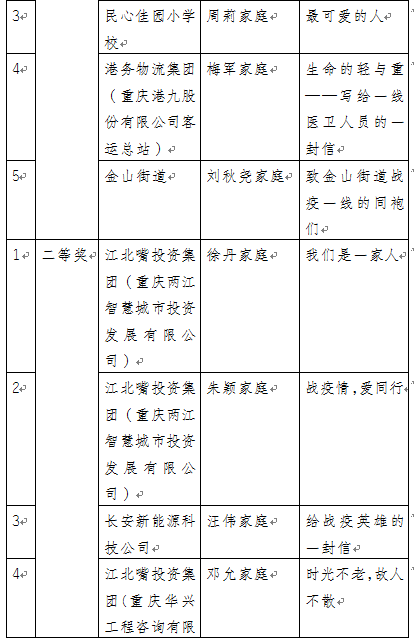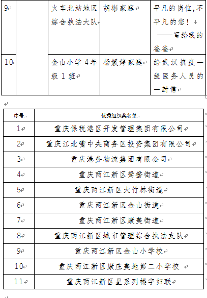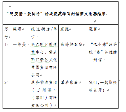 记者从两江新区妇联获悉,“战疫情·爱同行”给战疫英雄写封信征文比赛结果出炉,比赛共评选出一等奖5名、二等奖8名、三等奖10名及优秀组织奖11个。
