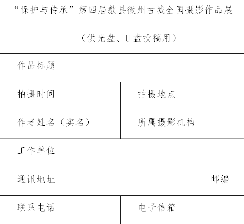 投稿作品以光盘(CD-R或DVD-R)、U盘存储形式邮寄至:北京市东城区东四十二条48号中国摄影报社活动部“第四届安徽歙县全国摄影作品展”办公室(100007)