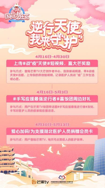 新型冠状病毒肺炎疫情发生以来,广大医护工作者一直奋战在艰苦的抗疫一线,涌现出许多逆行英雄和感人的故事。在5·12国际护士节即将来临之际,为致敬白衣天使和记录下这些人间“大爱”,芒果TV联合中国医师协会健康传播工作委员会在全网推出5·12护士节“逆行天使,我来守‘护’”主题征集活动,为医护工作者们输送坚实温暖的精神力量。
