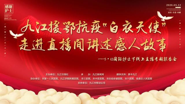 5月12日晚,由九江日报社主办,九江新闻网承办,掌中九江协办的“弘扬新时代‘抗疫精神’ 争做爱国好学生”九江援鄂抗疫“白衣天使”走进直播间讲述感人故事——5·12国际护士节线上直播专题报告会将举行,邀请九江援鄂抗疫“白衣天使”走进直播间讲述感人故事。同时,报告会将特别邀请九江的学生和家长收听观看,共同学习抗疫英雄不惧艰险、大爱无疆的崇高职业精神,激发学生们的爱国主义情怀,彰显新时代青少年有大爱精神和拼搏奋斗精神。