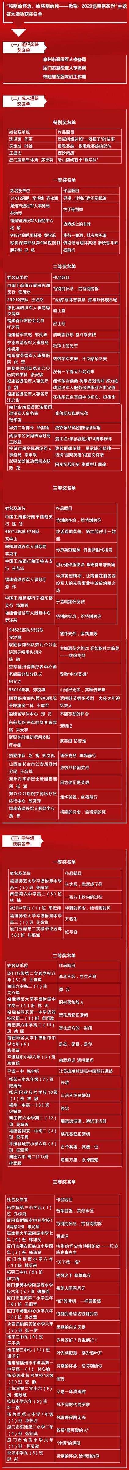 近日,经省退役军人厅、福建师大、省教育电视台相关领导、专家评选,共评出成人组特别奖4名,一等奖5名,二等奖15名,三等奖20名;学生组一等奖5名,二等奖15名,三等奖20名;活动组织奖3个。(记者 颜财斌)