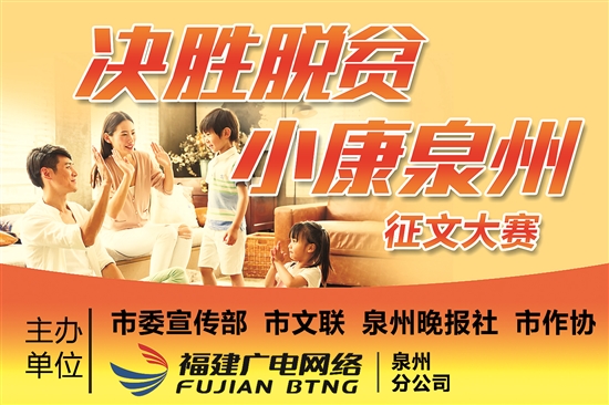 今年是脱贫攻坚的决胜之年,将全面建成小康社会,实现第一个百年奋斗目标。为记录这具有里程碑意义的历史时刻,展现泉州这片热土决胜全面建成小康社会的美丽画卷,讲好新时代的泉州故事,由中共泉州市委宣传部、泉州市文联、泉州晚报社、泉州市作家协会、福建广电网络集团泉州分公司联合举办的“决胜脱贫·小康泉州”征文大赛今日启动,征稿活动同步展开。
