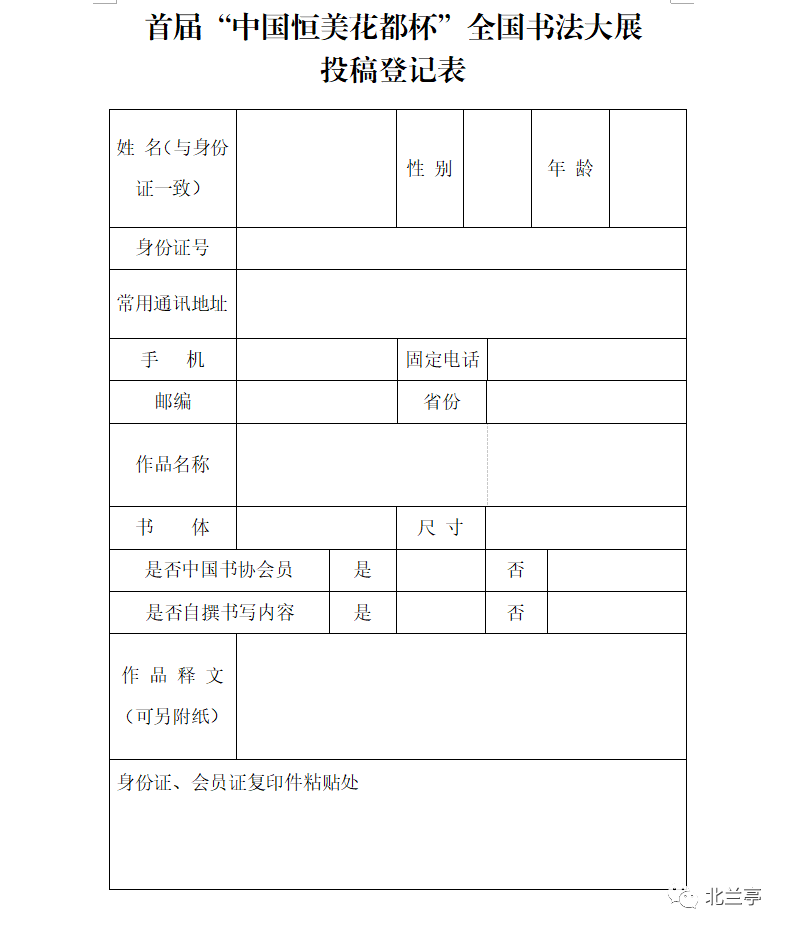 (2)为便于准确登记,及时联系作者,请认真填写《首届中国恒美花都杯书法大展投稿登记表》(启事后附表格,可复印使用,也可从北兰亭官方微信平台(各专业媒体网站)下载),连同身份证复印件和书写内容使用的版本复印件,随作品一并寄出。