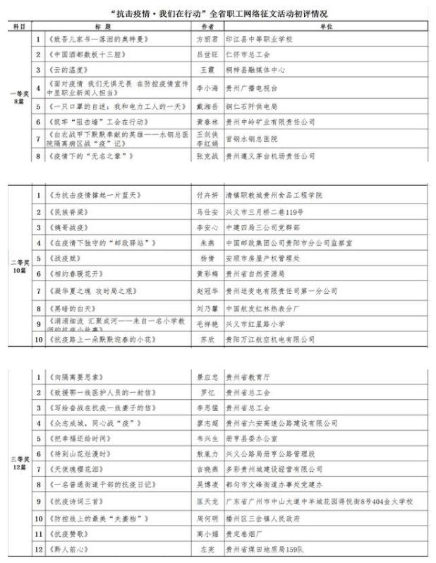 6月17日,记者从“中国梦·劳动美——抗击疫情·我们在行动”贵州省职工网络征文活动主办方获悉,经评审组公开公正评审,获奖作品和优秀组织奖获奖单位名单正式“出炉”(名单附后)。《云的温度》等8篇作品获一等奖,《为抗击疫情撑起一片蓝天》等10篇作品获二等奖,《黔人前心》等12篇作品获三等奖。另外 ,6个市州总工会、产业(行业)工会荣获优秀组织奖。