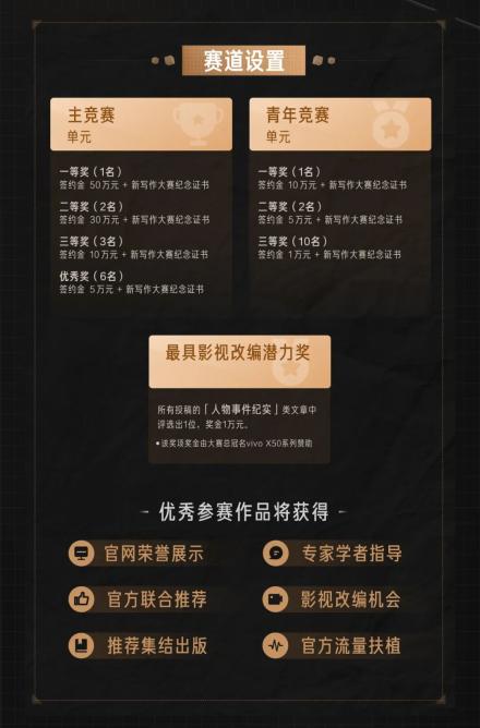 大赛同时设置「最具影视改编潜力奖」:从所有投稿的「人物事件纪实」类文章中评选出1位,奖金1万元。该奖项奖金由大赛总冠名vivo X50 系列赞助。