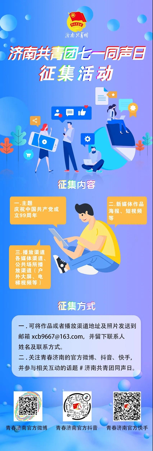 其中,为迎接党的生日,“七一同声日”将面向社会征集新媒体作品海报、短视频等,共同庆祝中国共产党成立99周年,活动征集的作品有望在各媒体渠道以及户外大屏、电梯视频等公共场所渠道播出。