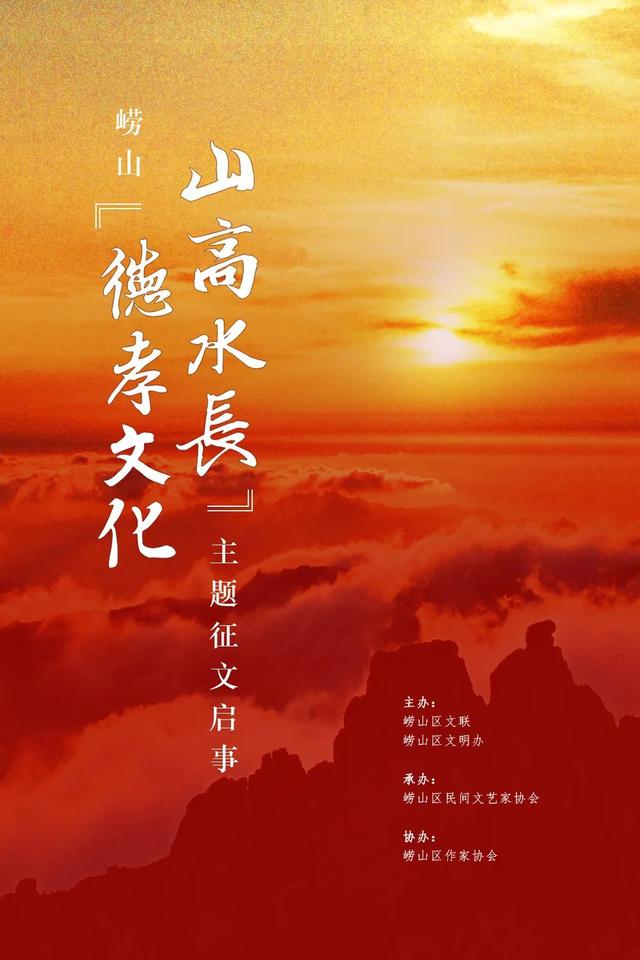 为深入传承中华优秀传统文化,大力弘扬社会主义核心价值观,充分展现崂山独特人文风情,促进崂山民间文艺事业繁荣发展,进一步丰富崂山新时代文明实践活动,由崂山区文联、崂山区文明办主办,崂山区民间文艺家协会承办,崂山区作家协会协办的崂山“山高水长·德孝文化”主题征文活动,现面向全国征集相关作品。