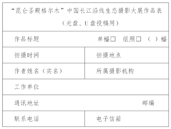 投稿作品以光盘(CD-R或DVD-R)、U盘存储形式邮寄至:北京市东城区东四十二条48号中国摄影报社活动部长江沿线生态摄影大展办公室收(100007)