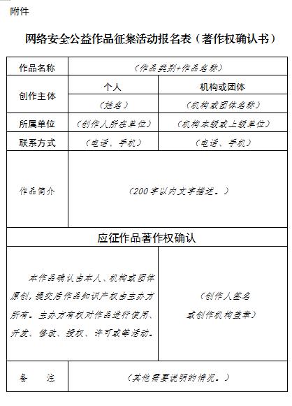 (二)本次征集活动以电子邮件方式提交为主,同时也可邮寄交付或直接交付。每位应征者除递交作品外,还应同时提交《网络安全公益广告征集活动报名表(著作权确认书)》,报名表(著作权确认书)由应征者亲笔签署;应征者为机构的,授权代表签署并盖机构公章;集体创作的,由所有创作者共同签署。