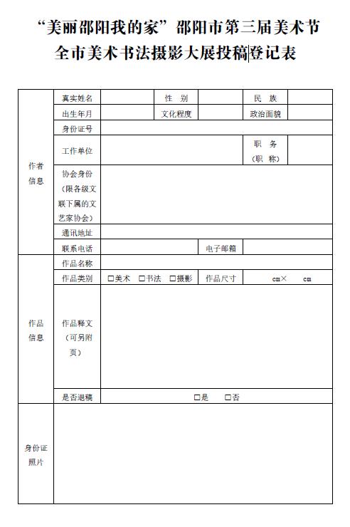 (2)所有投稿作者须认真填写《投稿登记表》(见附件,请粘贴好身份证复印件),随作品一并寄出。