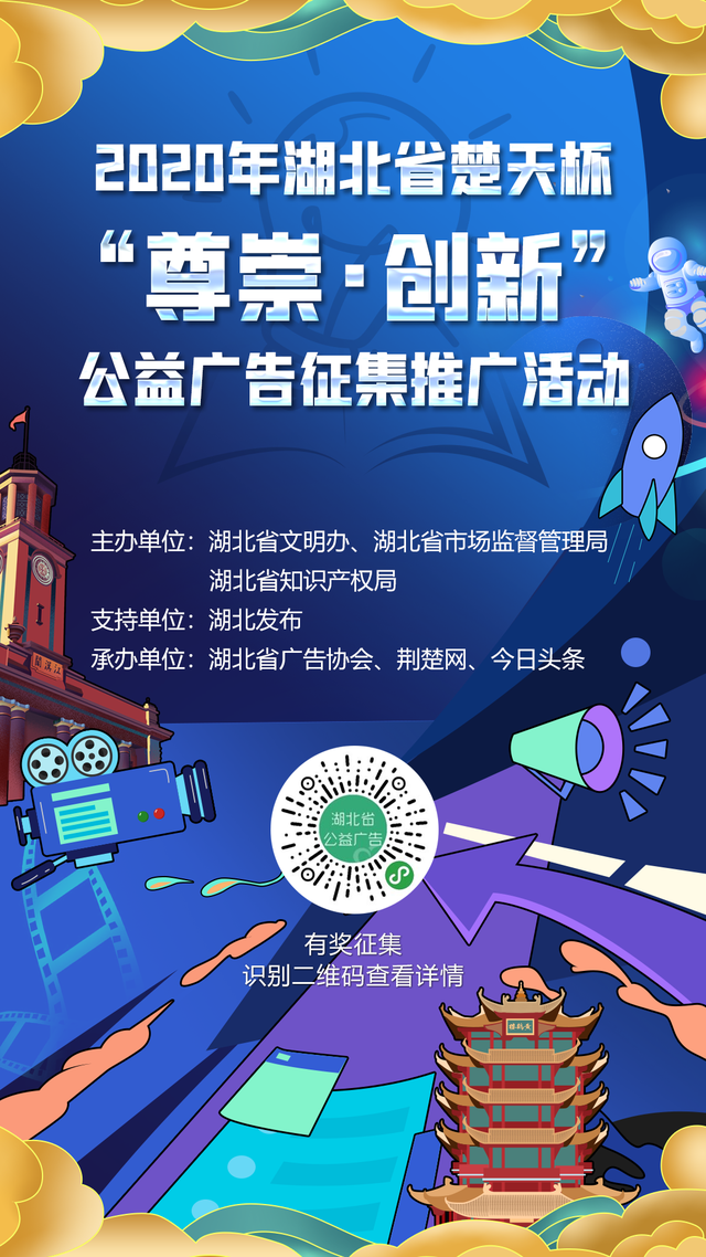 2020年湖北省楚天杯“尊崇·创新”公益广告征集推广活动正式拉开帷幕。活动以“尊崇·创新”为主题,旨在营造尊重生命、崇尚科学的良好社会氛围,充分发挥公益广告在培育和弘扬社会主义核心价值观的作用,彰显湖北风貌、打造湖北品牌。