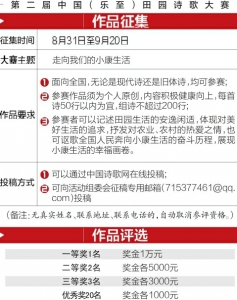 8月31日,资阳市乐至县与中国诗歌网、封面传媒、华西都市报再次携手,启动第二届中国(乐至)田园诗歌大赛征集评选活动。据大赛组委会发布的征稿启事显示,征集时间从8月31日持续到9月20日,最终将评选出一等奖1名、二等奖2名、三等奖3名、优秀奖20名,其中一等奖奖金1万元。