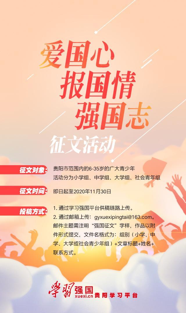 9月1日,由贵阳市委宣传部、贵阳市委教育工委(市教育局)主办,“学习强国”贵阳学习平台承办的“爱国心·报国情·强国志”大型征文活动正式启动,面向全市青少年、在校中小学生、大中专学生、各界青年征稿。