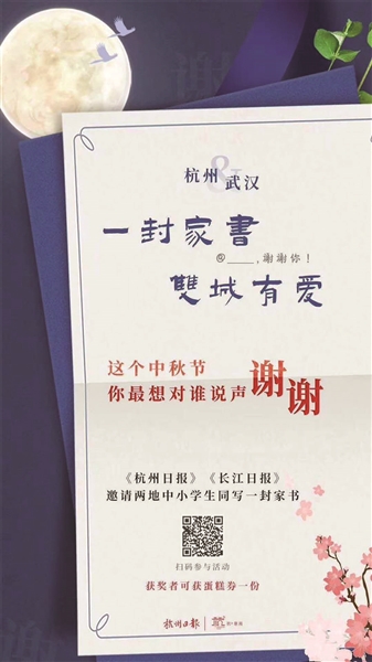 活动邀请了五位专家评审,里面有诗人、作家,还有省特级教师等,阵容强大。后期,我们将在杭州日报学点点上公布获奖名单。获奖者将获得由主办方颁发的“最系列”荣誉证书、优秀家书合辑一册以及奖品(可莎蜜儿消费券一份)。获奖者还有机会参与后续的“一封家书”电台直播。(记者 胡鸿)