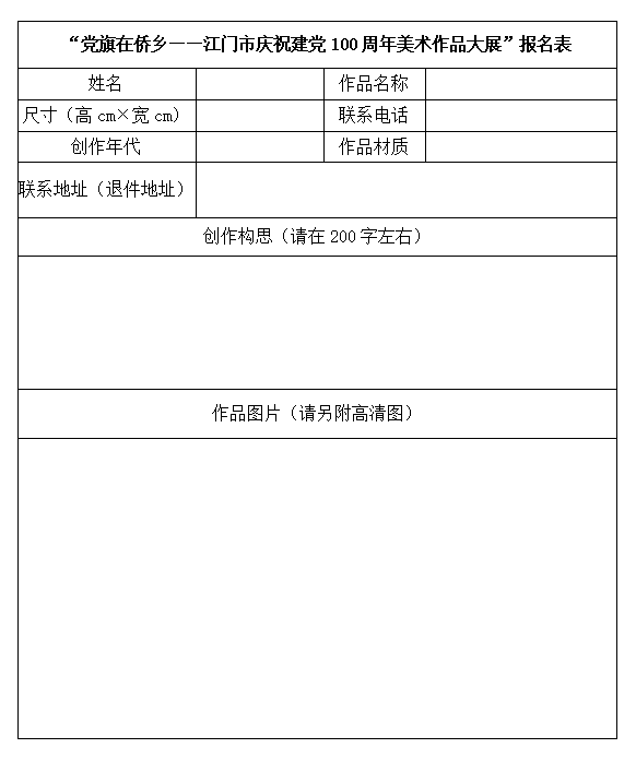3、初评请把作品的高清(不小于7MB、分辨率不低于300dpi、jpg格式)精美彩色电子图片,文件名为作品详细信息(作品名称、作者姓名、材质、尺寸、创作年代、联系电话),连同填写报名表,一并发送至邮箱:492901238@qq.com,联系人:梁小姐,0750-3936725。