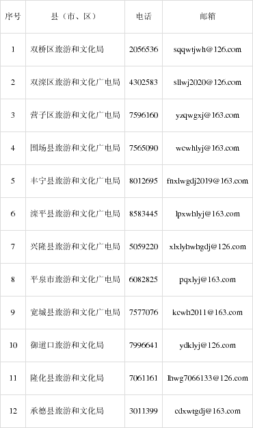 1.承德市旅游和文化广电局资源科邮箱:cdlyzy@126.com,电话:2050022;