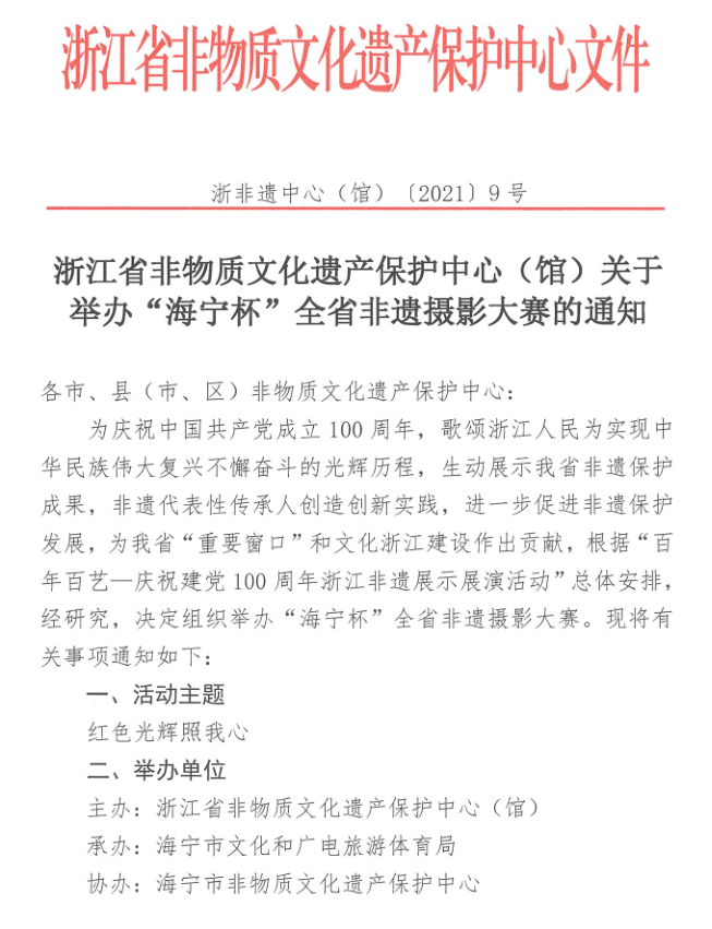 为庆祝中国共产党成立100周年,歌颂浙江人民为实现中华民族伟大复兴不懈奋斗的光辉历程,展示浙江省非遗保护成果,由浙江省非物质文化遗产保护中心(馆)主办,海宁市文化和广电旅游体育局承办,海宁市非物质文化遗产保护中心协办的“海宁杯”全省非遗摄影大赛开始向您征稿啦!