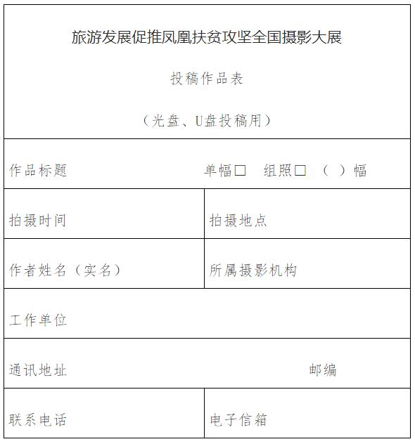 投稿作品以光盘(CD-R或DVD-R)、U盘存储形式邮寄至:北京市东城区东四十二条48号中国摄影报社活动项目部“旅游发展促推凤凰扶贫攻坚”全国摄影大展办公室收(100007)