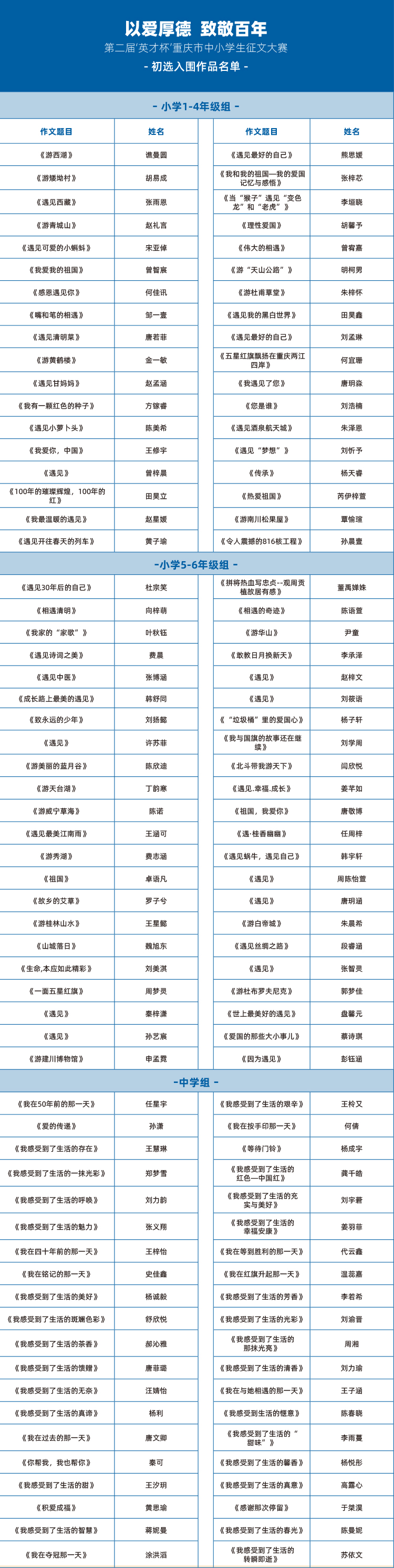 新鲜出炉!“以爱厚德·致敬百年:第二届‘英才杯’重庆市中小学生征文大赛”初选作品名单公布!