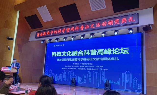 4月23日下午,科技文化融合科普高峰论坛暨首届“歌曲中的科学密码”科普征文活动颁奖典礼在长沙市图书馆举行。活动由长沙市科协、湖南省科普作家协会、中南大学联合主办。