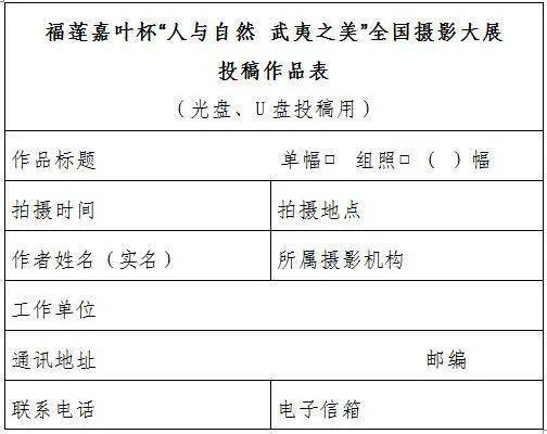 光盘、U盘包装盒上注明该展名称,每幅作品文件名处注明作品标题,同时提供作者资料及投稿作品表(word文档)。投稿作品为JPG格式,图片统一处理为长边800-1000像素,文件大小控制在200-500KB以内。无相关资料的投稿作品,主办单位有权取消其参评资格。投稿作品以光盘(CD-R或DVD-R)、U盘存储形式邮寄至:北京市东城区东四十二条48号中国摄影报社活动项目部 福莲嘉叶杯“人与自然 武夷之美”全国摄影大展办公室收(100007)