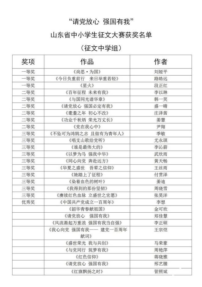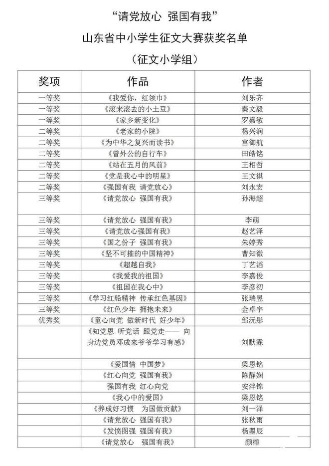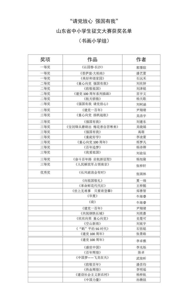 为加强全省中小学生爱国主义教育,继承发扬党的优良传统,谱写青春正能量,山东广播电视台联合“学习强国”山东学习平台开展了“请党放心 强国有我 ”山东省中小学征文/书画大赛,引导广大学生为伟大“中国梦”发奋学习、不懈奋斗,用文字和书画记录表达爱国之情。大赛共收到作品1500多件,经过专家评审,现将获奖名单进行公示: