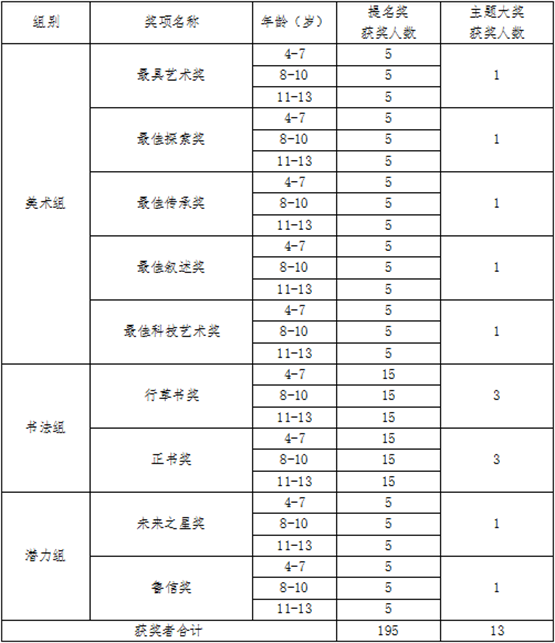 大赛共设9项奖项,奖项共分为3个组别:美术组、书法组、潜力组;其中,美术组设置5项主题大奖:最具艺术奖、最佳探索奖、最佳科技艺术奖、最佳叙述奖、最佳传承奖;书法组设置2项主题大奖:正书奖、行草书奖;潜力组设置2项主题大奖:鲁信奖、未来之星奖。大赛初评阶段选拔入围奖580名(540名个人,40名机构或教师)。终评阶段选拔提名奖195名,美术组与潜力组每项主题大奖将拥有15名提名奖获奖者(获奖名额按年龄组平均分配:4~7岁5名,8~10岁5名,11~13岁5名)、书法组每项主题大奖将拥有45名提名奖获奖者(获奖名额按年龄组平均分配:4~7岁15名,8~10岁15名,11~13岁15名),并最终从提名奖获奖者中评选出13名主题大奖获得。