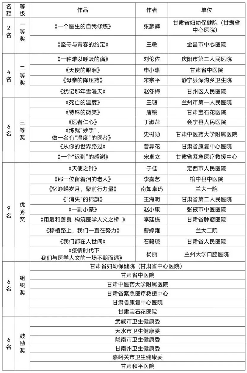 8月16日,甘肃省卫生健康系统开展的“医学人文”征文活动,最终评出21家医疗机构的21件获奖作品,分别为一等奖2名,二等奖4名,三等奖6名,优秀奖9名;并根据报送作品质量和数量情况确定集体奖12名,其中组织奖6名,鼓励奖6名。