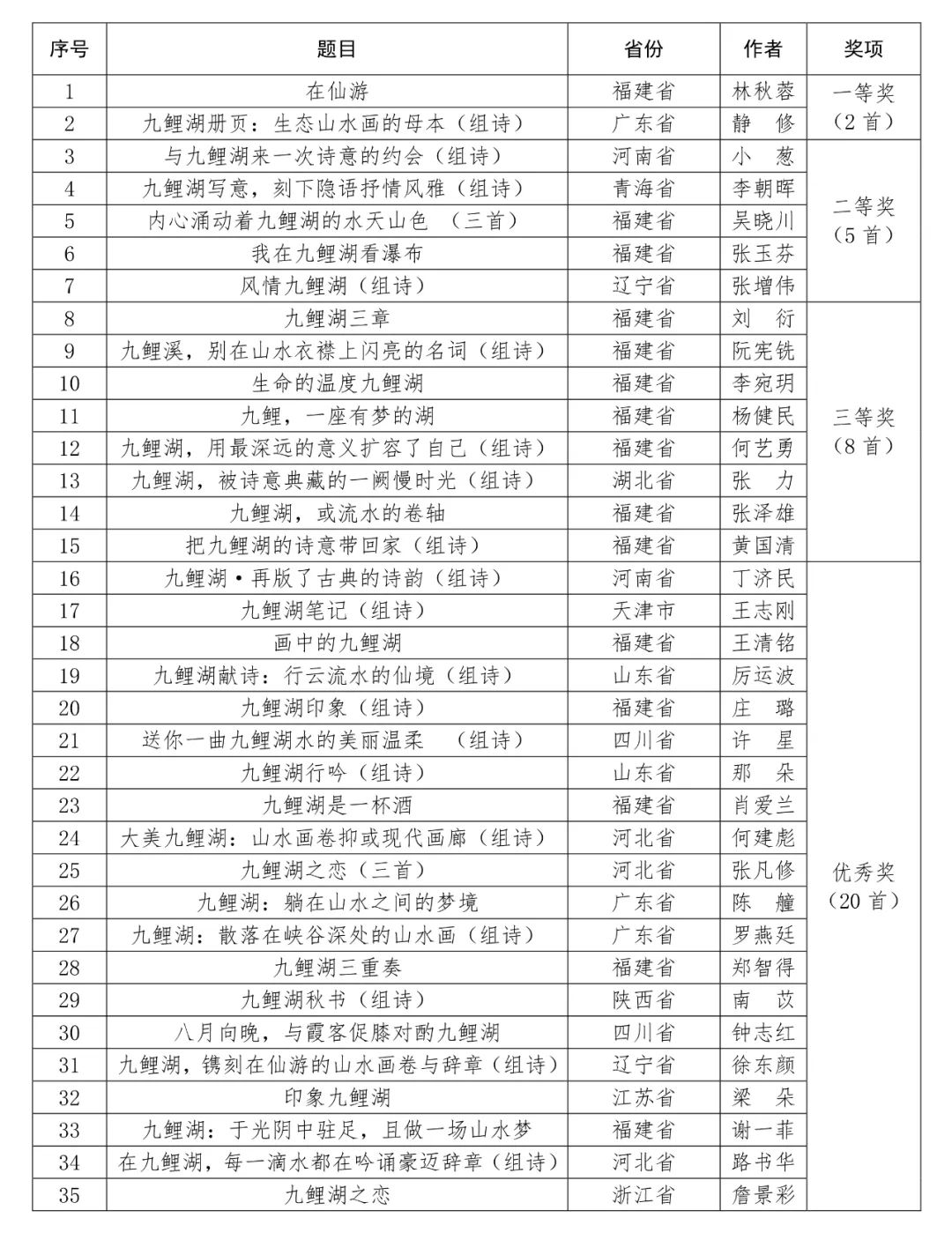 由福建省作家协会指导,仙游县文学艺术界联合会、仙游县九鲤湖管委会、仙游县作家协会、仙游县全域旅游发展有限公司联合举办的“我为九鲤湖献首诗”诗歌征集活动(征稿启事)经过初评、终评以及公示,最终评选出一等奖2首、二等奖5首、三等奖8首、优秀奖20首,现将获奖名单公布如下: