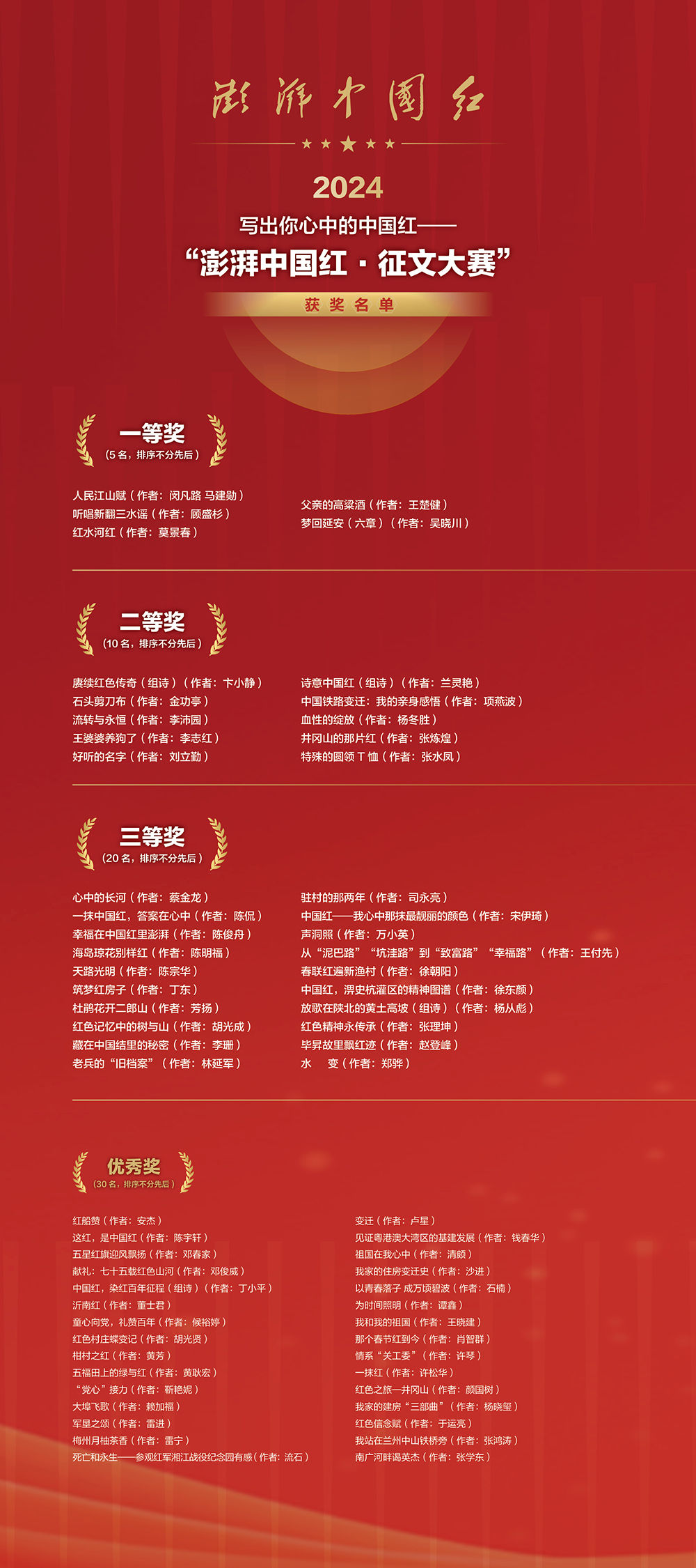 2024“澎湃中国红·征文大赛”是“澎湃中国红”系列阅读活动的重要内容,由新华出版社、新华社中国经济信息社陕西中心、中共嘉兴市南湖区委宣传部及新华书店总店等单位联合发起,陕西西凤酒股份有限公司特别支持。希望通过征文在更广泛的群体厚植爱国主义情怀,营造红色文化氛围,凝聚建功新时代的蓬勃力量。