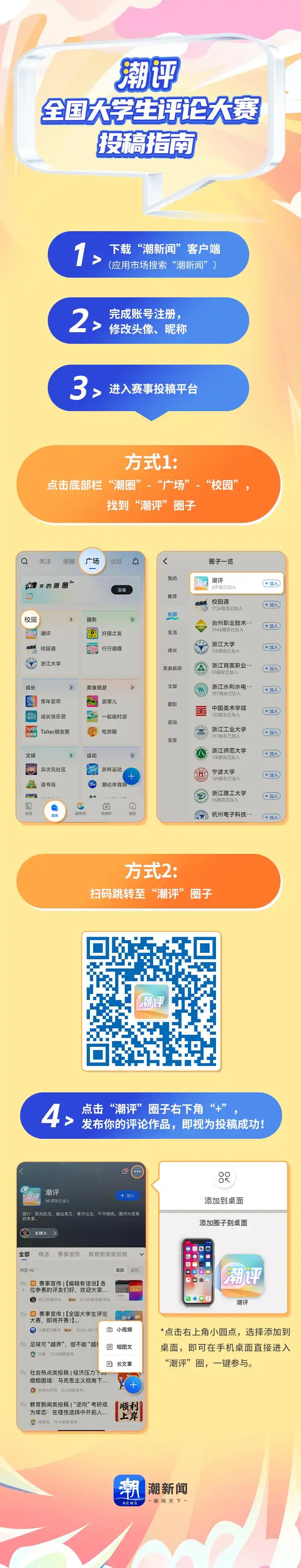 本次活动投稿主阵地为潮新闻客户端的“潮评”圈子,欢迎所有参赛者登录潮新闻客户端,进入潮圈频道,点击右下角“+”按钮,选择小视频/长文章形式,上传评论内容,选择圈子“潮评”,发布自己的作品。浙江日报和潮新闻客户端将择优刊登。