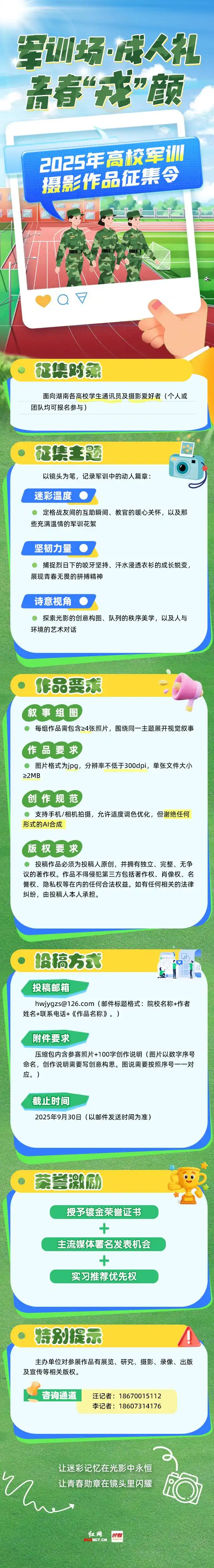 为定格高校军训中的动人画面,全方位展现青春的热血与风采,由红网精心主办的“军训场·成人礼 青春‘戎’颜”2025年高校军训摄影作品征集活动,正式火热启动。