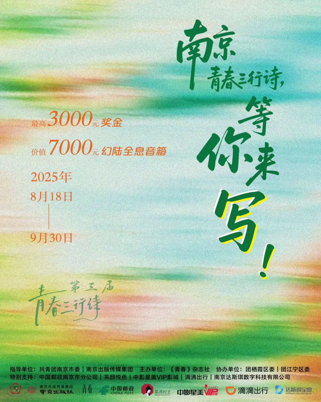 个人小红书、抖音或视频号任意一个平台账号发布原创作品,带话题#青春三行诗 #我在南京的日子 #第三届青春三行诗,并将发布链接及三行诗文本发送邮箱:qingchunshs@163.com