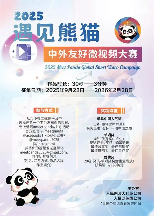 由人民网澳大利亚公司、人民网英国公司联合主办的2025“遇见熊猫”中外友好微视频征集大赛将于2025年9月22日正式启幕,并持续至2026年2月28日,面向全球网民广泛征集参赛作品。