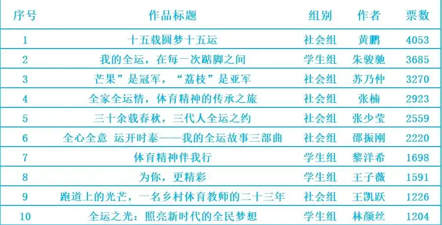 经过线上投票,来自社会组的作品《十五载圆梦十五运》以4053票脱颖而出,成为“我们的全运故事”全民征文大赛的“人气王”!激动人心的颁奖仪式即将到来,届时将会有全运彩蛋恭候获奖选手。(记者 柴智)