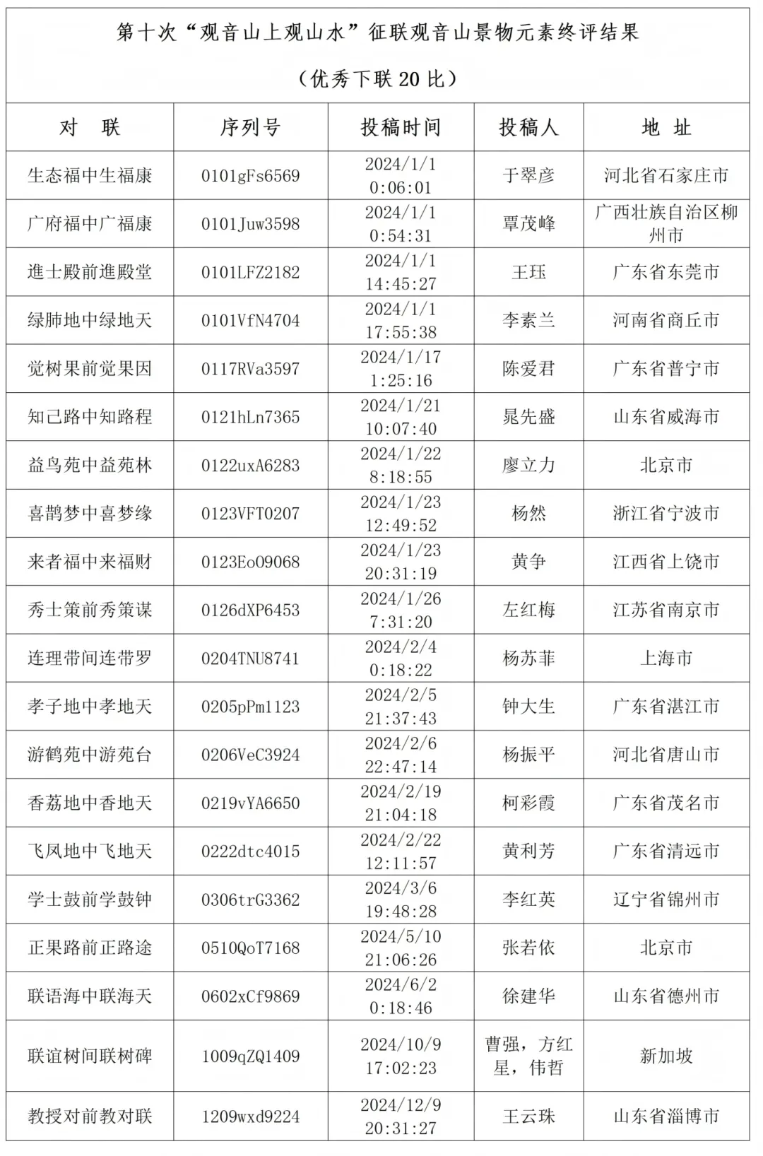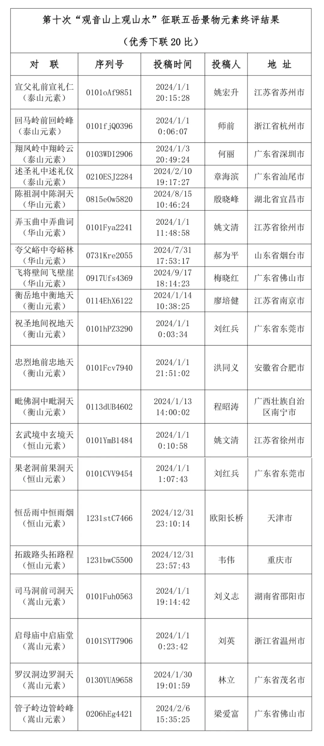为弘扬中华优秀传统文化,普及中国楹联文化知识,壮观音山山门,广东观音山国家森林公园联合广东楹联学会,面向全社会有奖征集“观音山上观山水”下联,活动自2015年至今历时11年共举办10次,吸引了海内外楹联家及爱好者广泛响应,堪称举世瞩目的文化盛事。为践行初心,以圆山梦,2024年1月1日00:00,广东观音山启动了第十次“观音山上观山水”征联活动,并融合以泰山、衡山、华山、恒山、嵩山五岳的景物元素作为应征对句的创作素材,社会反响巨大。截止2024年12月31日24:00,历经一年,本轮征联活动总收稿量243577句,其中以观音山元素创作的下联有197286句,以东岳泰山元素创作的投稿作品有15311句,以西岳华山元素创作的投稿作品有8616句,以南岳衡山元素创作的投稿作品有7917句,以北岳恒山元素创作的投稿作品有8786句,以中岳嵩山元素创作的投稿作品有5661句。