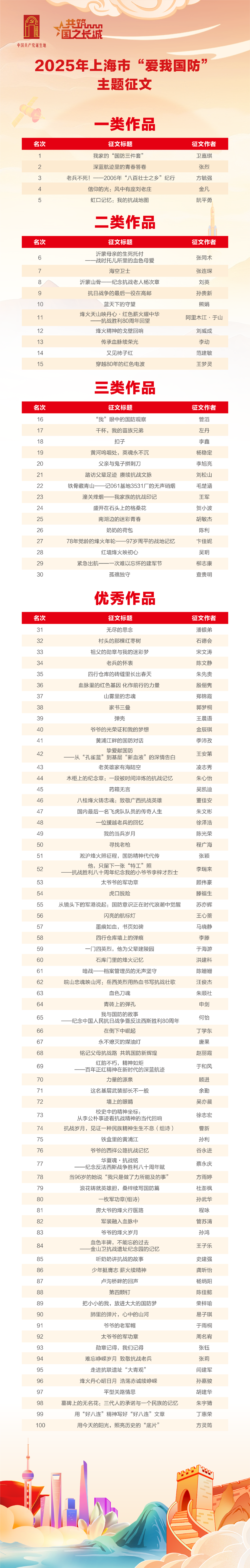 铭记八十载峥嵘,汇聚强国力量。在纪念中国人民抗日战争暨世界反法西斯战争胜利80周年的重要历史时刻,由市委宣传部联合上海警备区政治工作局、市教委、市退役军人事务局、市国动办、市海防办等部门共同主办的2025年上海市“爱我国防”主题征文活动于近日圆满结束,评选结果正式揭晓。
