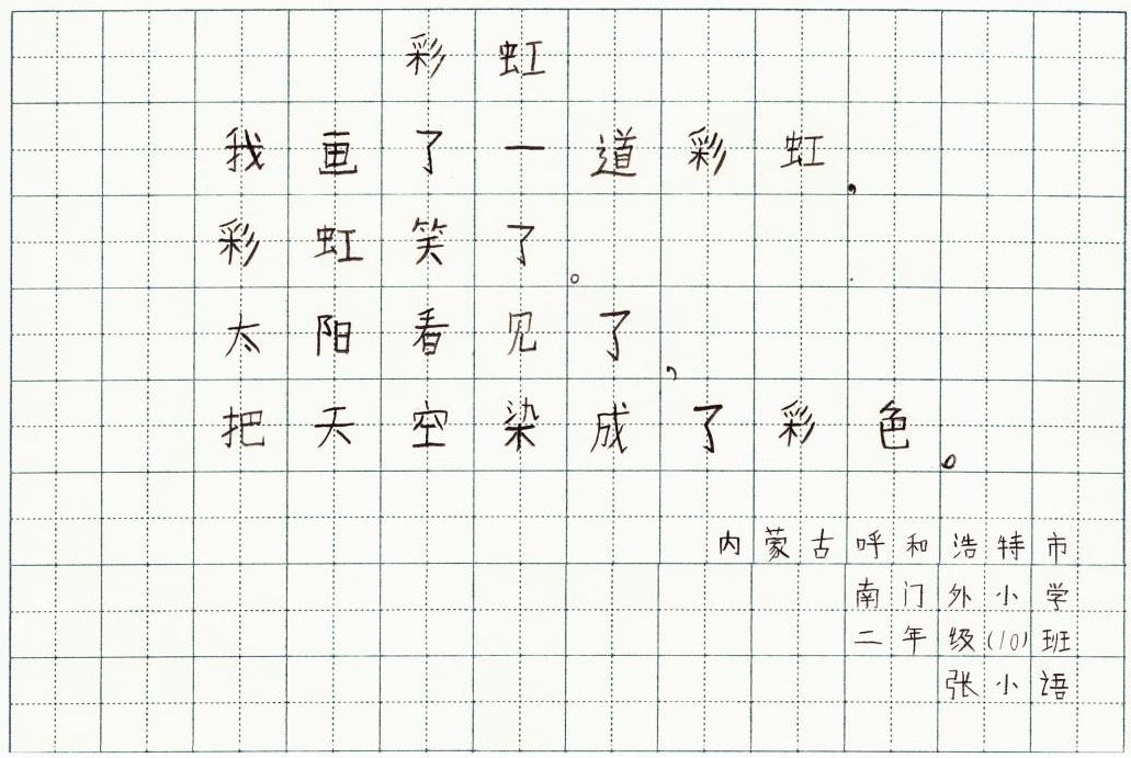 1、为便于文学展览展出,投稿须提交本人书写的纸质稿,纸张材质、大小不限。诗稿落款需写明省区、学校、年级、姓名(示例如下)。