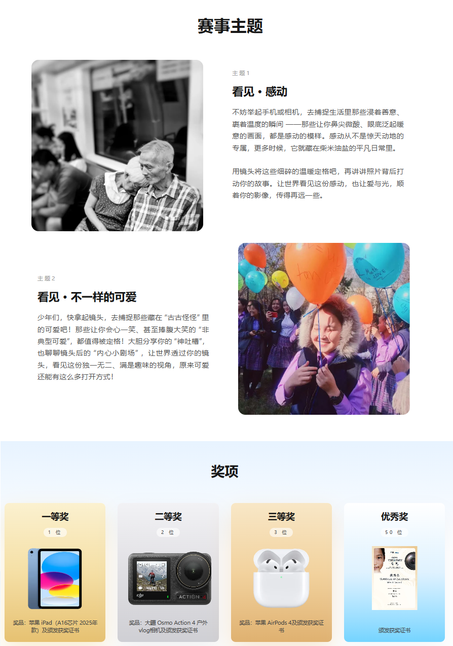 本届大赛以“看见感动”与“发现不一样的可爱”为双重主题,旨在鼓励青少年通过摄影观察生活、表达自我。以镜头为眼,共同参与一场关于“看见”的温暖行动——无论是家庭中的亲情互动、校园里的成长点滴、朋友间的真挚情谊,抑或是平凡日常中的微小确幸,皆可成为镜头下的动人题材。