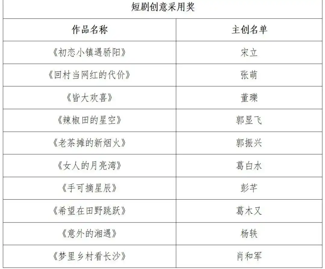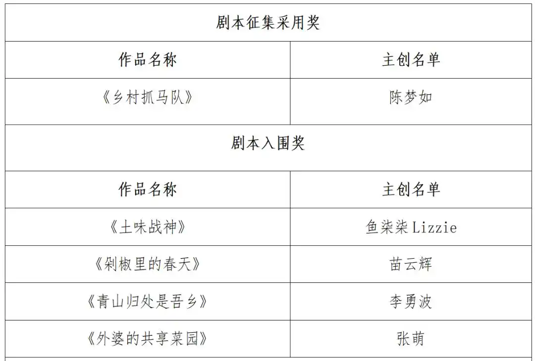 本次大赛共评选出三大类奖项,包括剧本征集采用奖1名、剧本入围奖4名、及短剧创意采用奖10名,奖项公示如下: