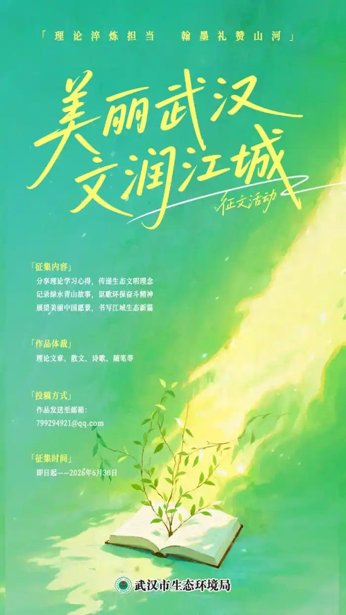武汉市生态环境系统“美丽武汉 文润江城”理论学习和生态文学征文活动正式启动,期待你执笔抒怀,用文字传递生态力量。