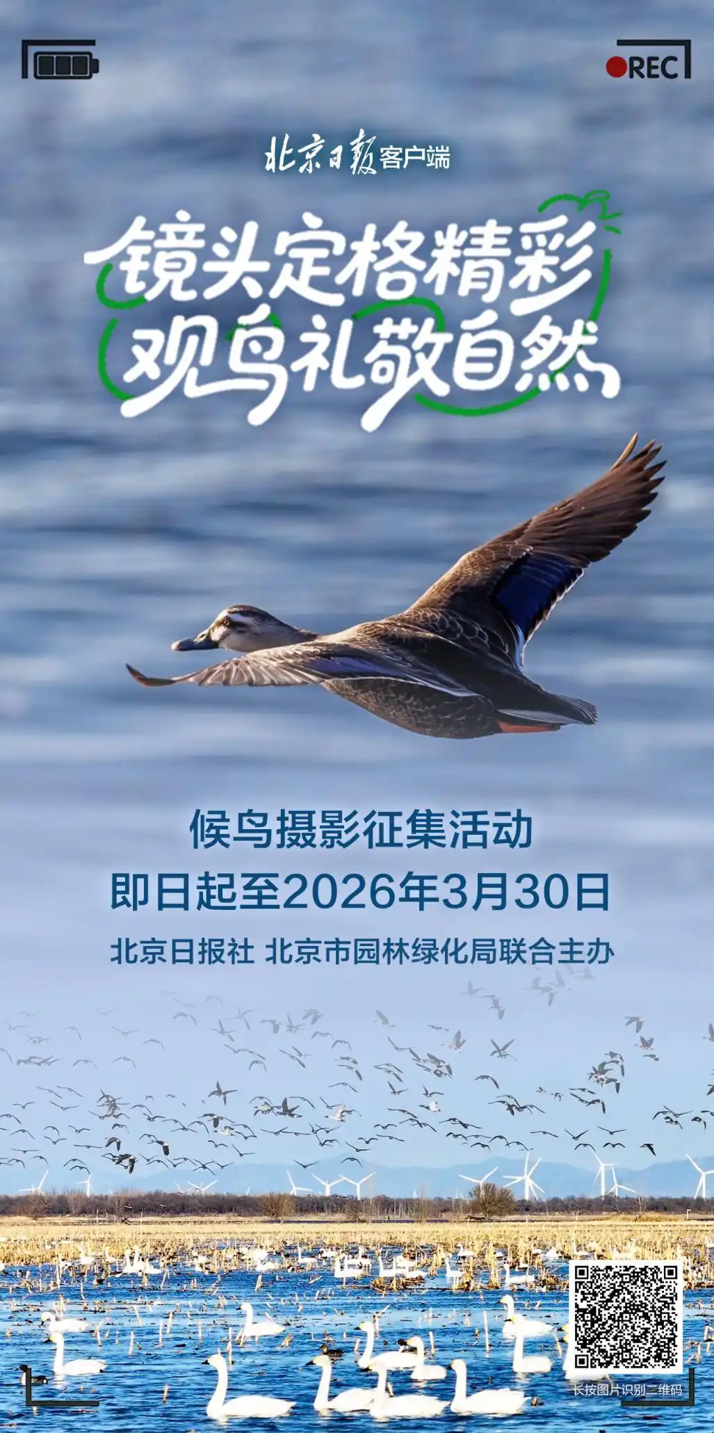 本次摄影大赛面向全社会公开征集摄影作品,围绕“镜头定格精彩,观鸟礼敬自然”主题,征集2025年至2026年候鸟迁徙季拍摄的作品,要求全方位展现候鸟迁徙季北京各处鸟类栖息地的景色、候鸟飘逸的身姿等内容。