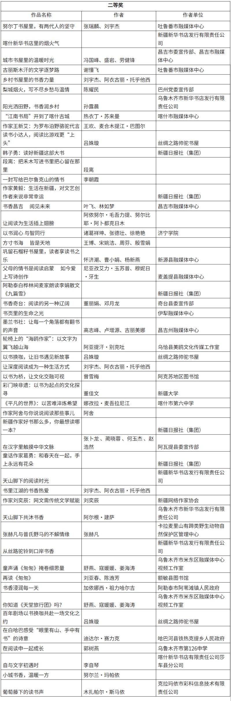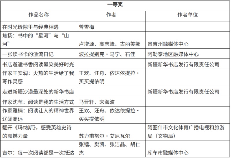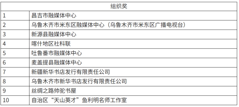 由自治区党委宣传部指导,新疆日报社(集团)主办的“书香满天山”全民阅读短视频征集活动,自启动以来收到大量优秀作品,经评审,最终评选出一等奖10件、二等奖50件、三等奖60件,组织奖10个。为维护活动的公平公正,培育尊重原创、恪守诚信的品格,现将拟获奖名单公示如下,接受社会各界监督。